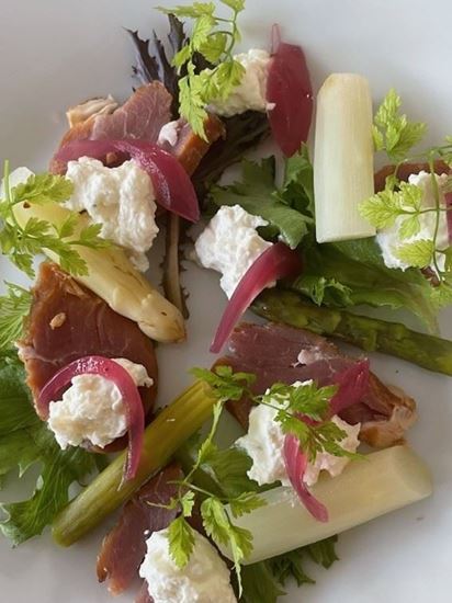 • Hjemmerøget svinemørbrad hertil rygeost creme og smørdampet asparges Inkluderet i menuen